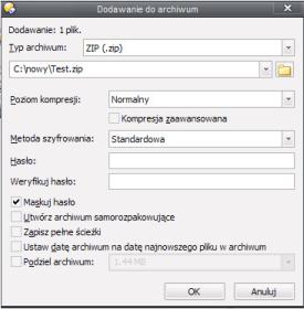 To narzędzie znane jest np. z programu WinRAR. W Directory Opus mamy bardzo podobne narzędzia do tworzenia archiwum. Do wyboru mamy aż 6 typów archiwum w tym także ten najbardziej popularny czyli RAR. Poziomy kompresji te same co w typowych archiwizerach, ja zawsze wybieram Najlepszy ;)W zależności jaki typ archiwum wybierzemy, będą dostępne nieco inne opcje. W moim przypadku pozostawiłem domyślny typ – ZIP. Możemy wybrać metodę szyfrowania, do wyboru są 3 metody oraz standardowa. Oczywiście nie mogło zabraknąć bardzo ważnej opcji czyli dodawanie hasła do utworzonego archiwum. Plik również można podzielić np. jeśli zajmuje sporo miejsca a chcemy go nagrać na płyty CD czy DVD to ustawiamy odpowiednią opcję.