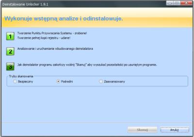 - Pośredni – zawiera Tryb bezpieczny ale wykonuje rozszerzone skanowanie aby usunąć pozostałości po aplikacji z miejsc gdzie najczęściej pozostają śmieci